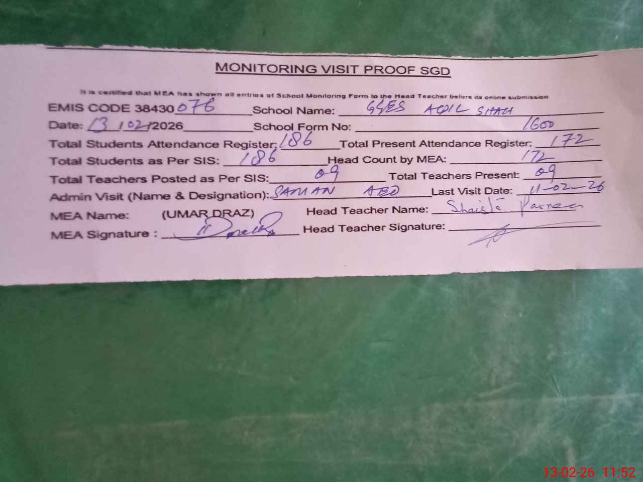 | EMIS Code: 38430076 | Name of School: GGES AQIL SHAH KALAN | |||