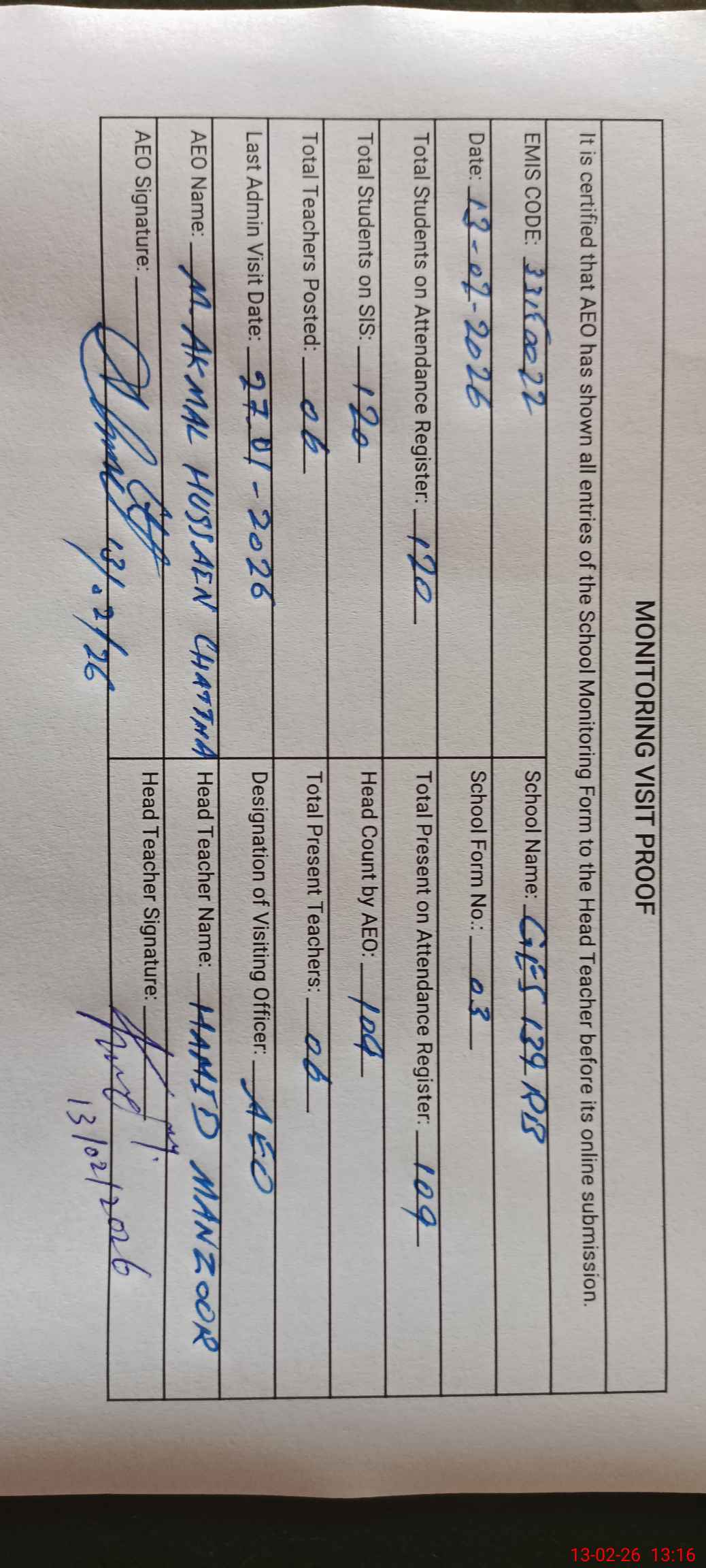 | Attendance Register | Head Teacher | MEA with School | Visit Proof |