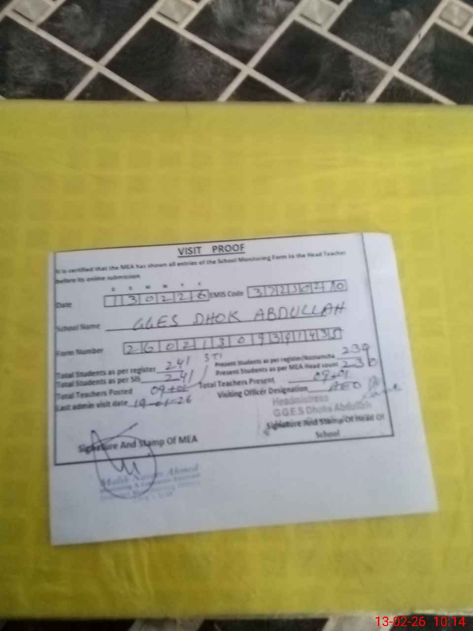 | Attendance Register | Head Teacher | MEA with School | Visit Proof |