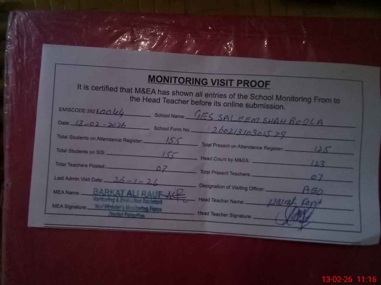 | Attendance Register | Head Teacher | MEA with School | Visit Proof |