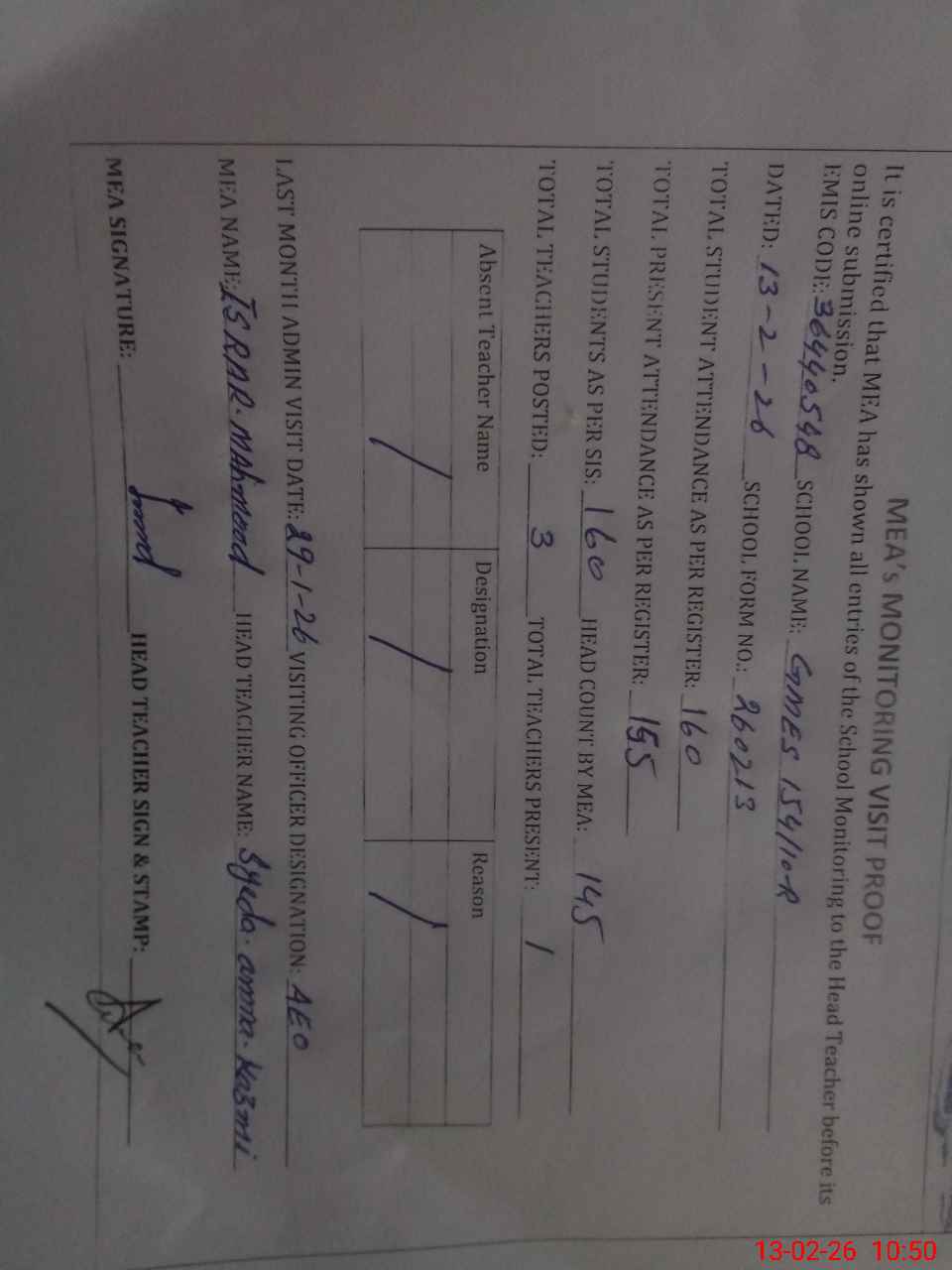 | Attendance Register | Head Teacher | MEA with School | Visit Proof |