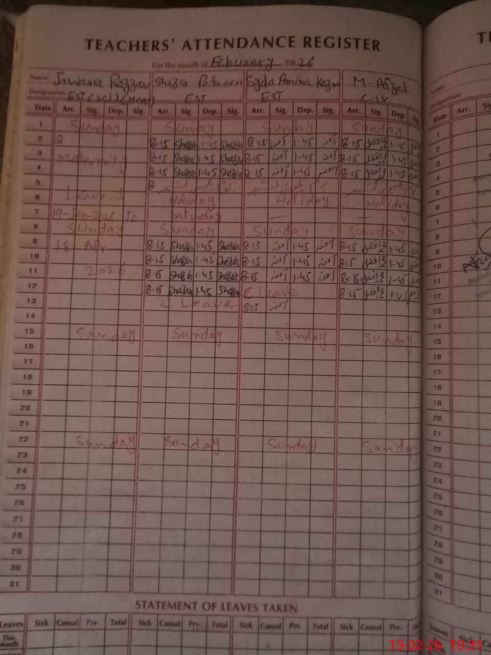 | Leave | Duty | Absent | Maternity | Medical | Ex- Pak |
