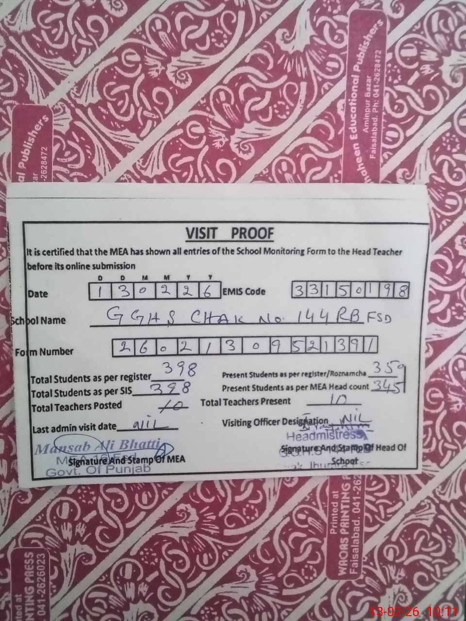 | Certified that this School was Inspected by the Undersigned MEA/DMO Today and the Information Stated Above is as Per Record. | |||||