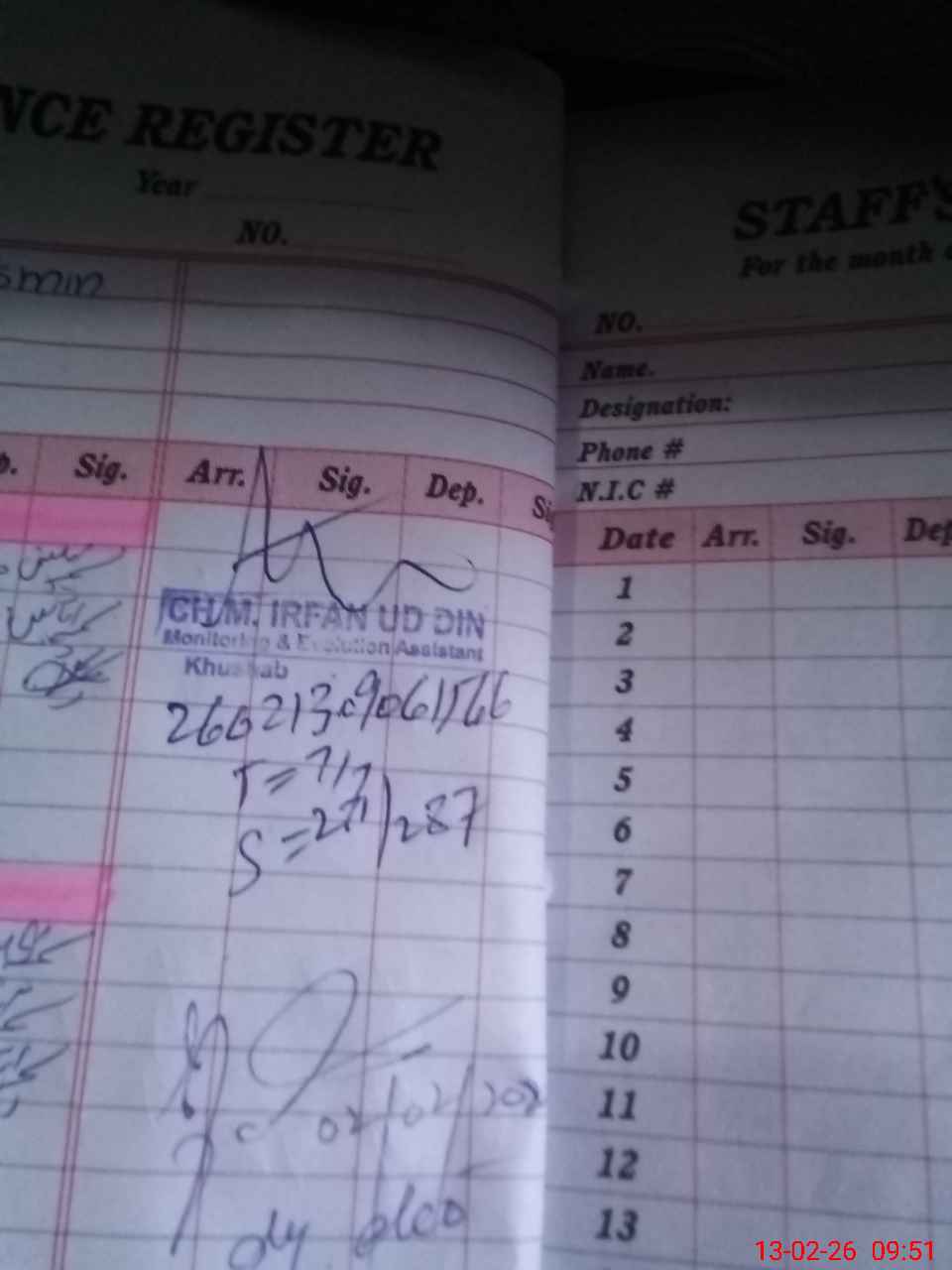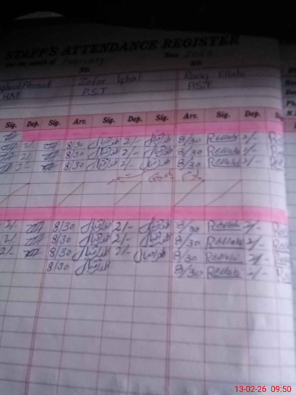 | Remarks (Use Separate Page if Required): gps khabaiki student on sis 287 student on register 287 head count 271 no teacher absent last ddeo and aeo 2 Feb class room under construction needs fund | |||||