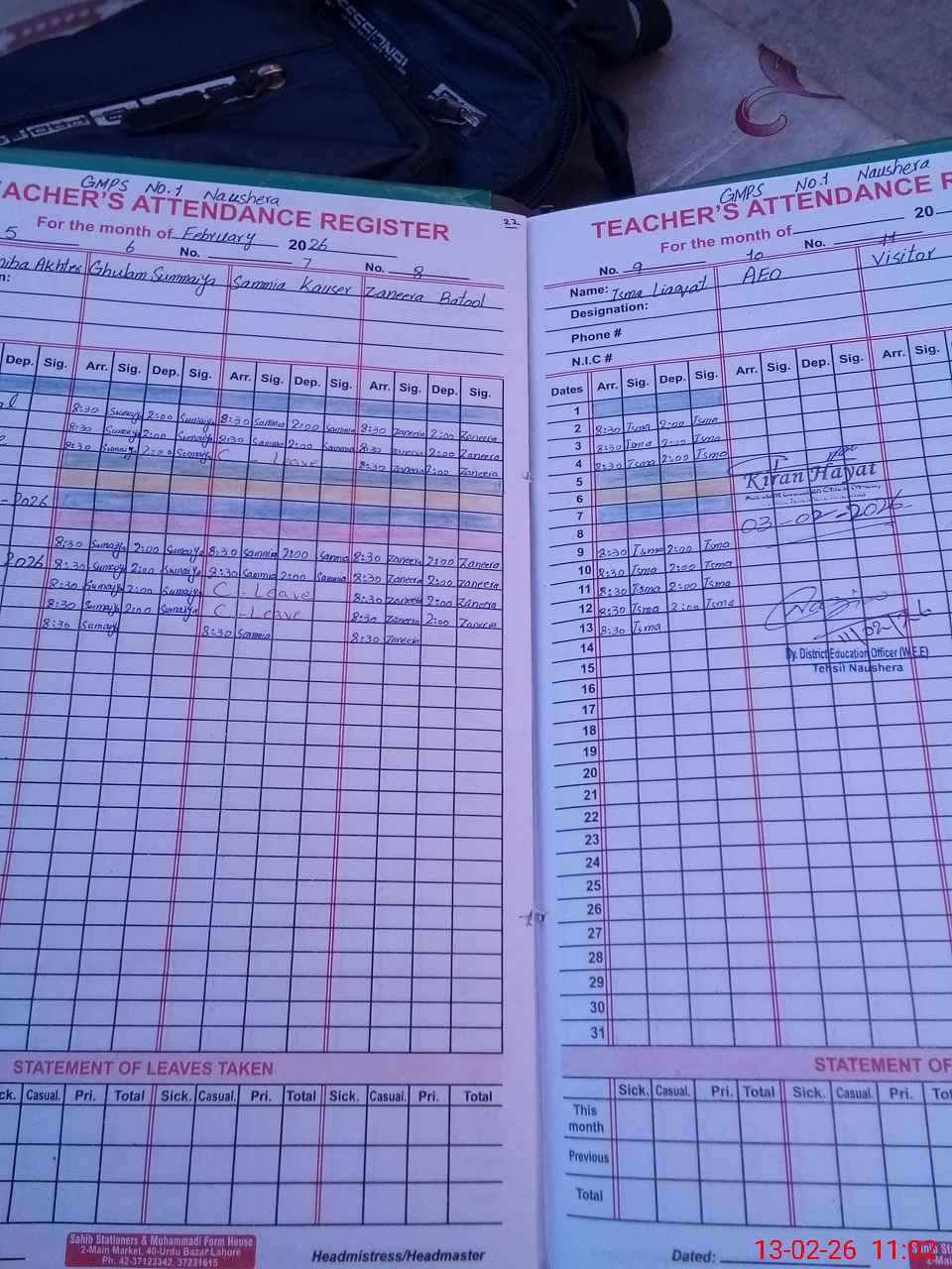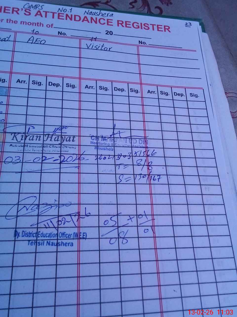 | Remarks (Use Separate Page if Required): gmps no1 nsh student on sis 167 student on register 167 head count 130 no teacher absent teacher sectioned posts are 7 but total teacher are 8 last visit ddeo 11/2/26 non teaching ng staff required ece student strength is 77 but room has no space for this much students an other ece room is required as half of stuff dent strength siting in other room classroom required washroom room required | |||||