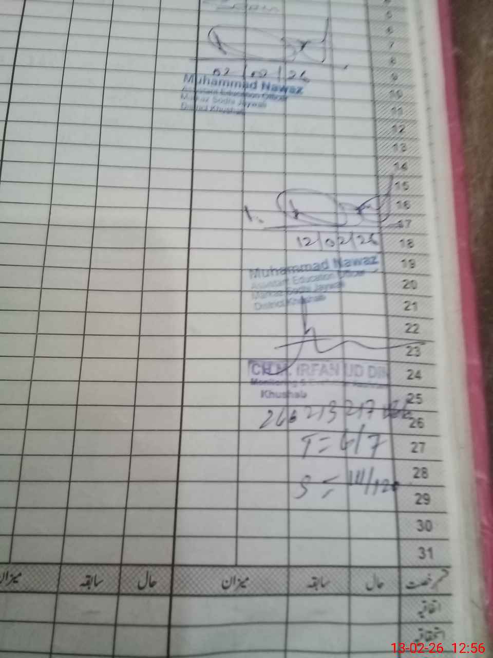 | Remarks (Use Separate Page if Required): GES mustafabad student on sis 120 student on register 120 head count 111 no teacher absent one on leave last visit aeo 12/2/26 boundary wall need repair student chairs 20 required | |||||