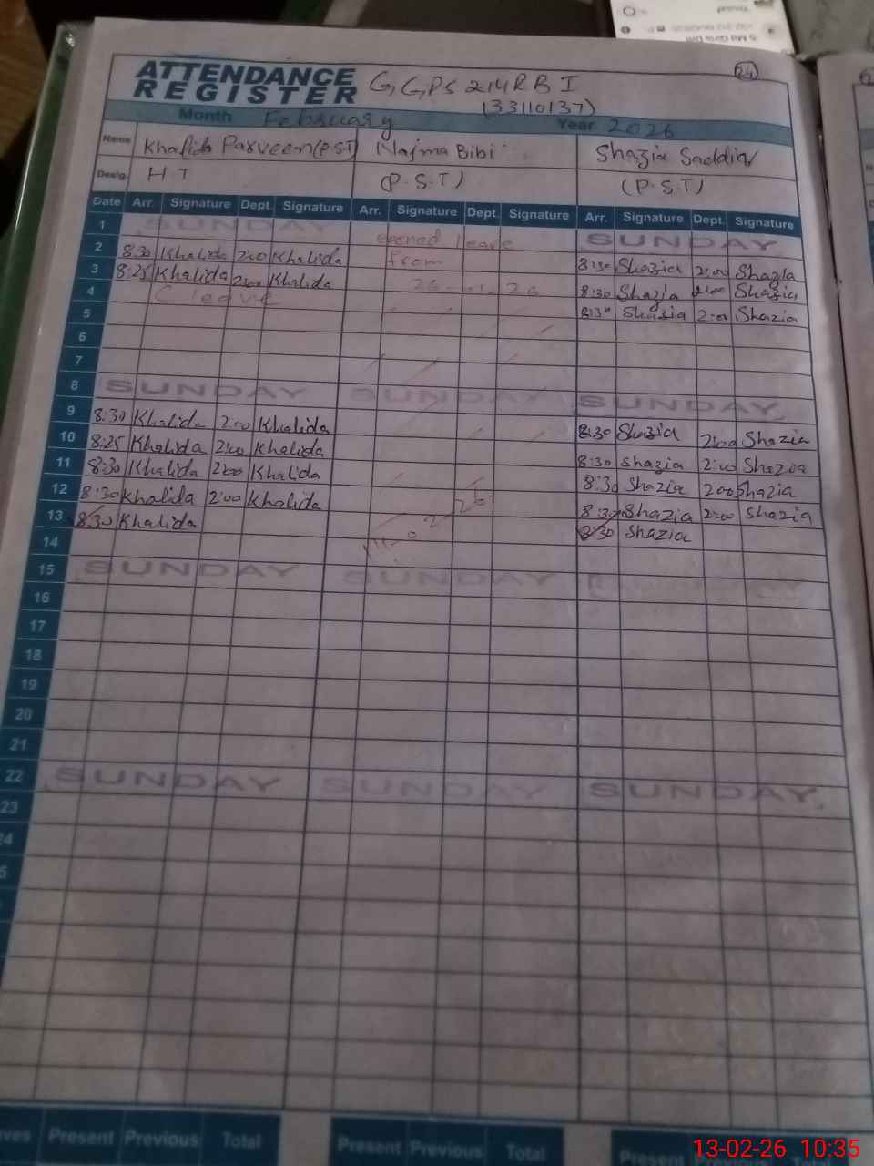 | CNIC | Full Name | Designation | R/C | Absence During Last Calender Month |
