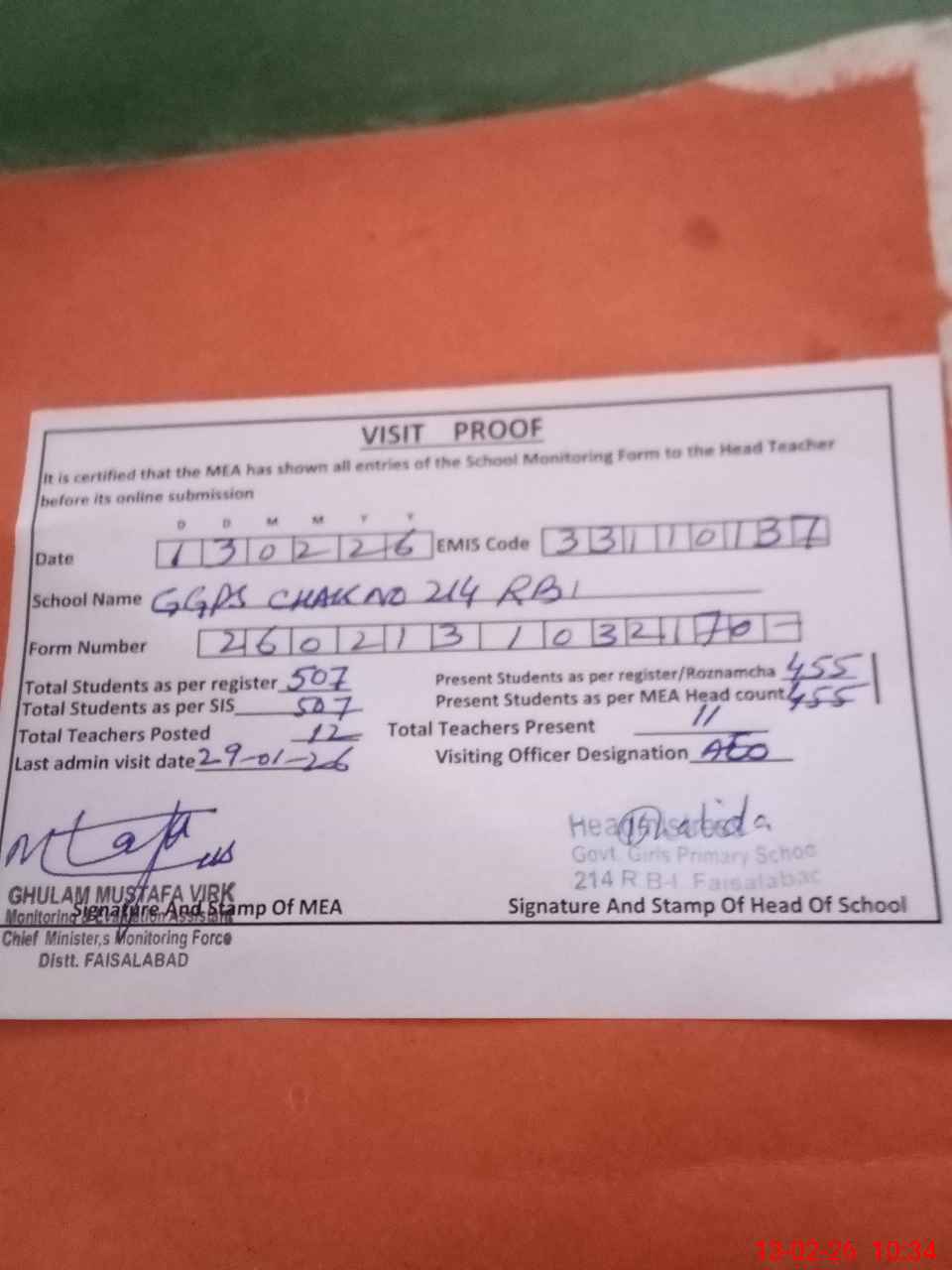 | Attendance Register | Head Teacher | MEA with School | Visit Proof |