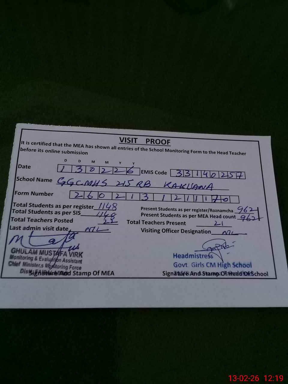 | Attendance Register | Head Teacher | MEA with School | Visit Proof |