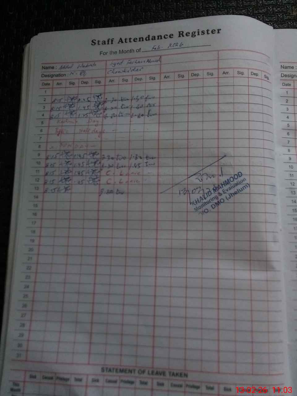 | CNIC | Full Name | Designation | R/C | Absence During Last Calender Month |