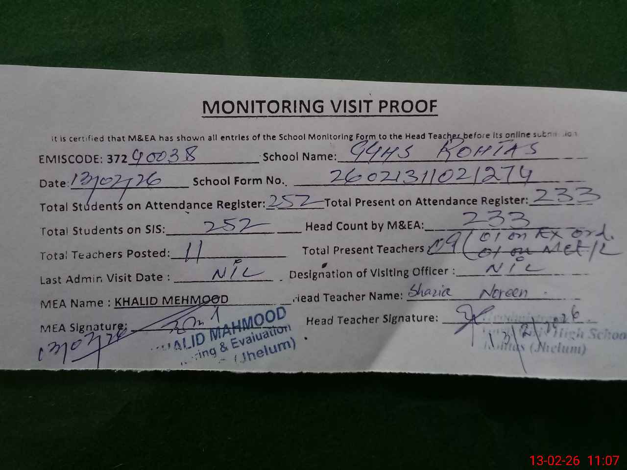 | Attendance Register | Head Teacher | MEA with School | Visit Proof |