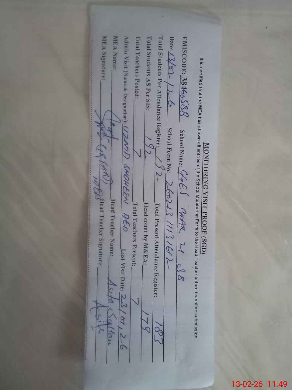 | Attendance Register | Head Teacher | MEA with School | Visit Proof |