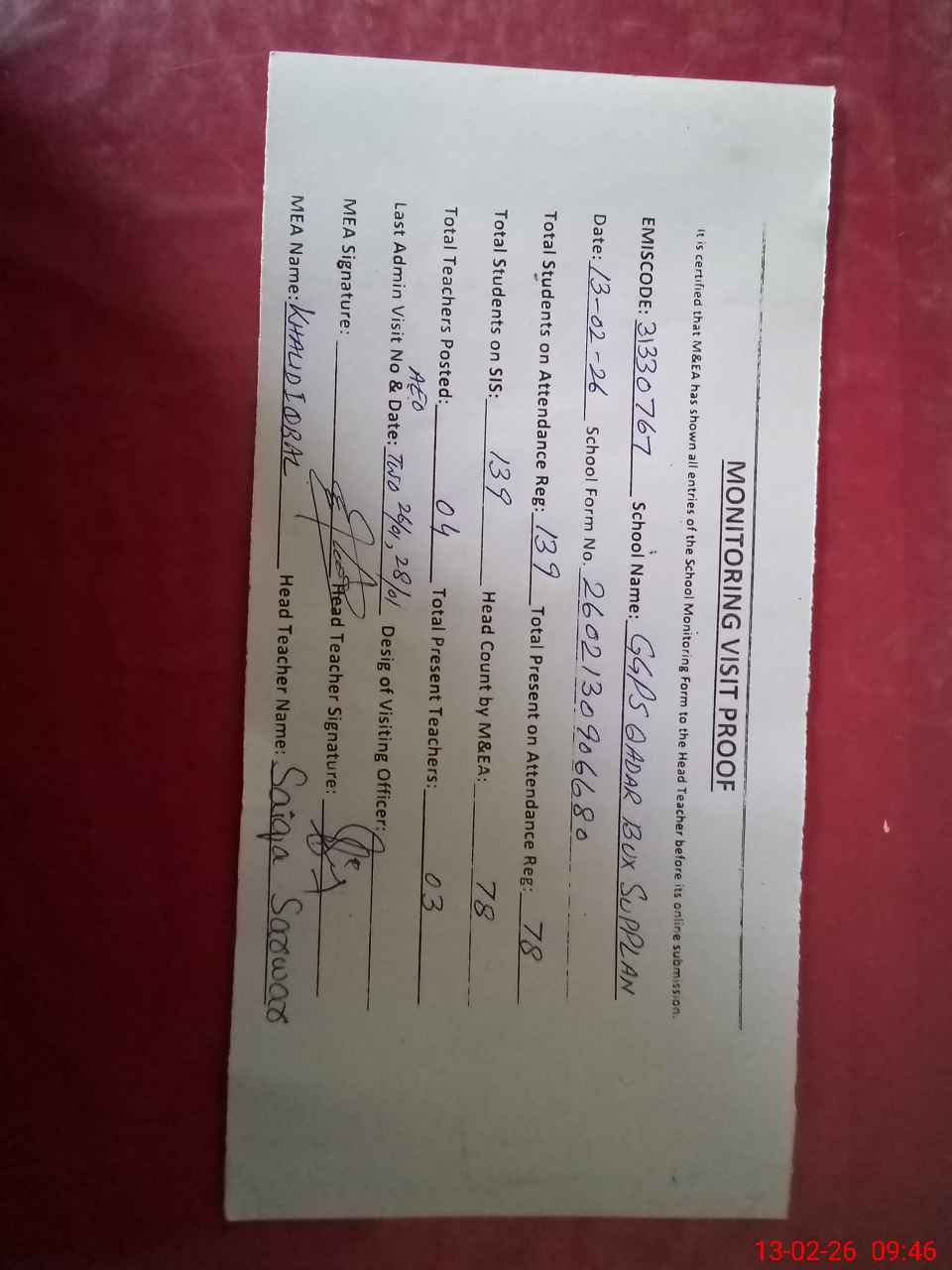 | EMIS Code: 31330767 | Name of School: GGPS QADAR BUX SUPPLAN | |||