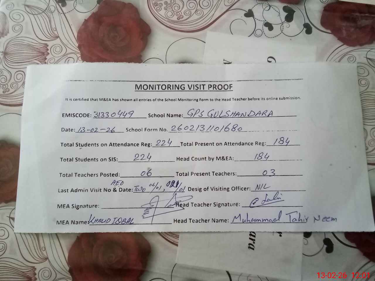 | EMIS Code: 31330449 | Name of School: GPS GULSHANDARA | |||
