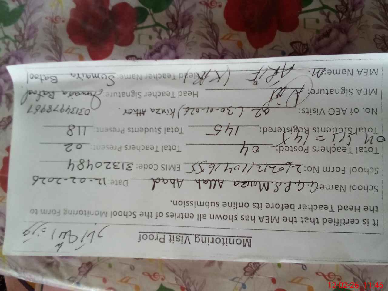 | Attendance Register | Head Teacher | MEA with School | Visit Proof |
