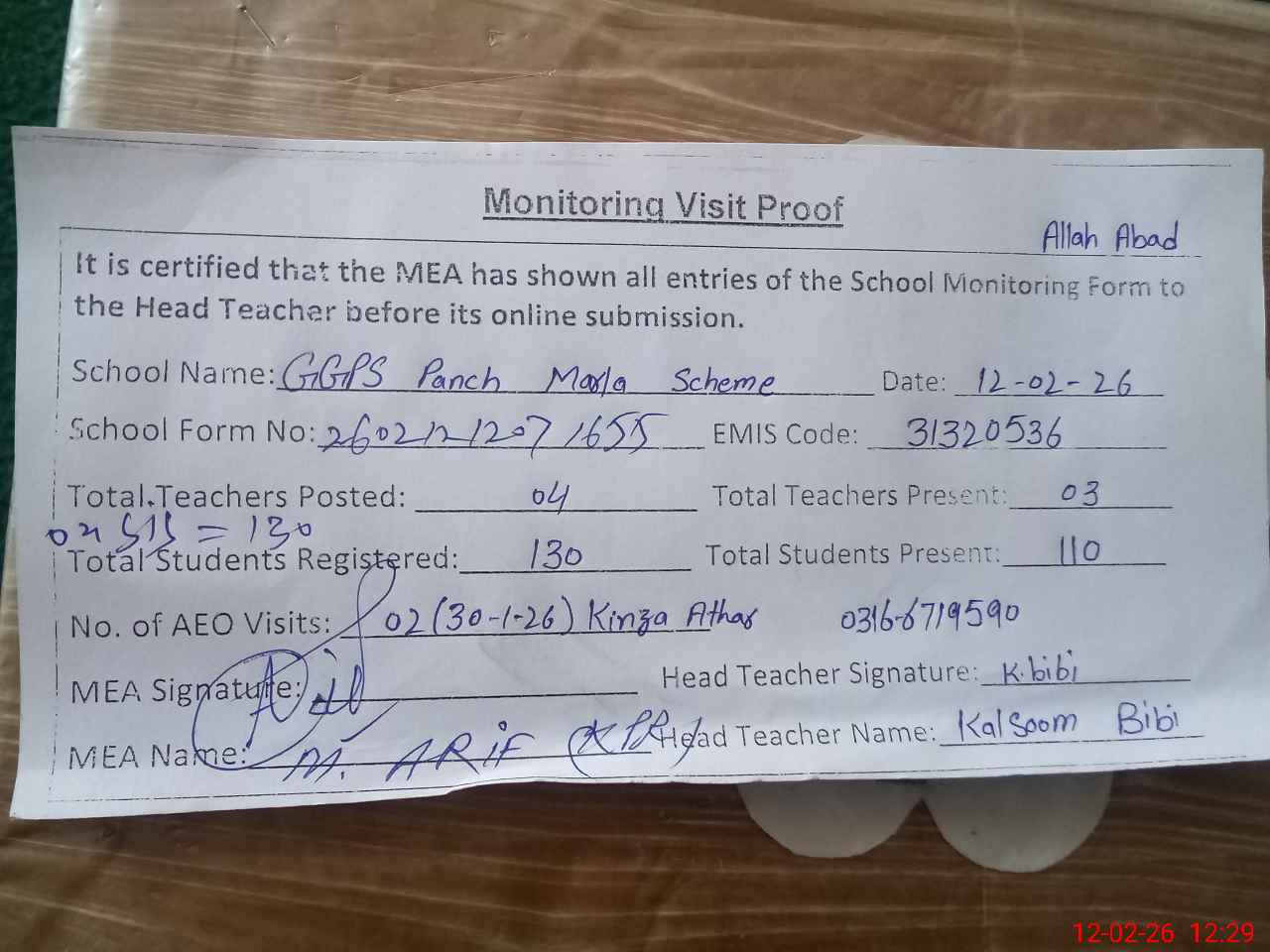 | Attendance Register | Head Teacher | MEA with School | Visit Proof |