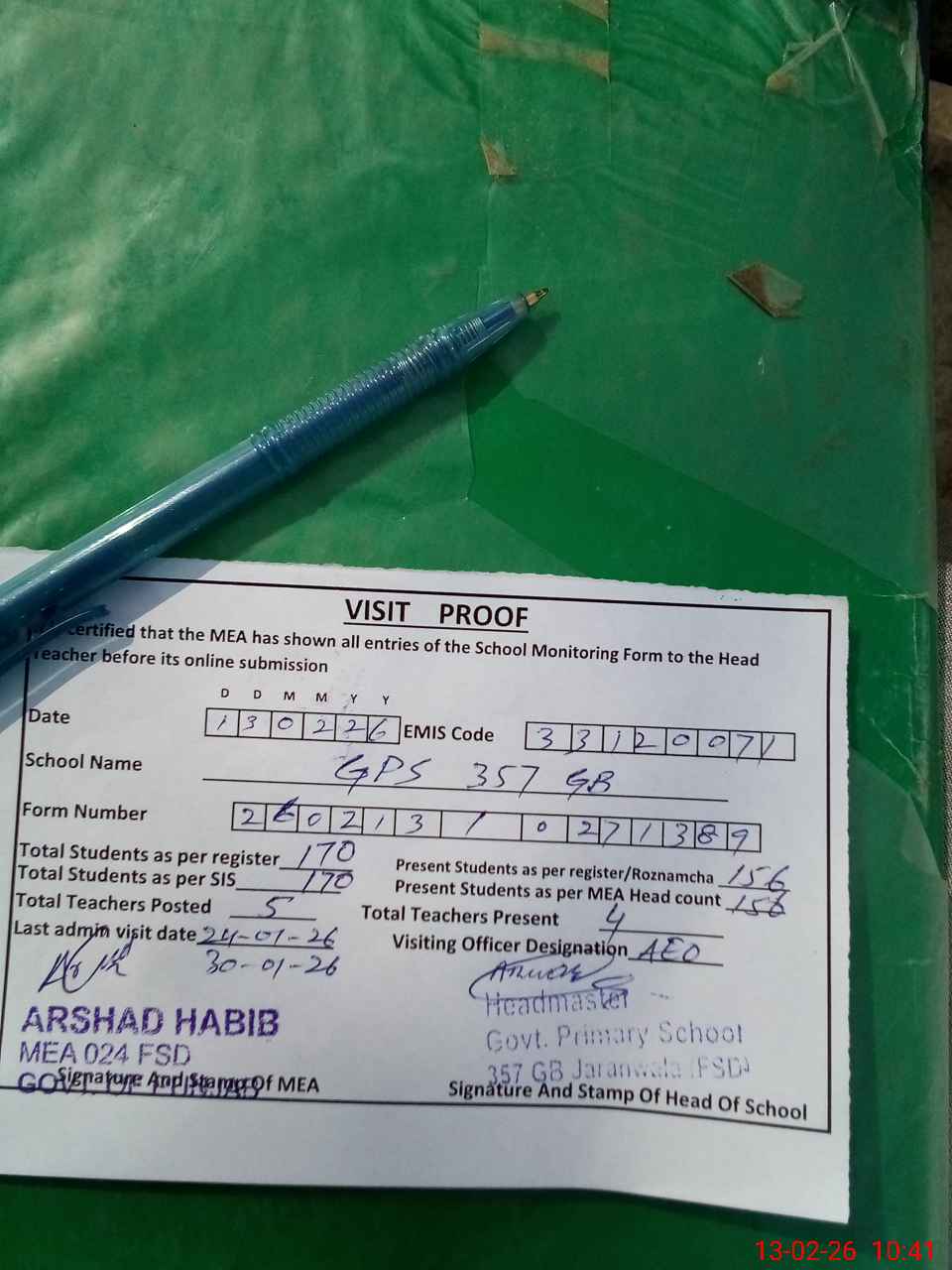 | Attendance Register | Head Teacher | MEA with School | Visit Proof |