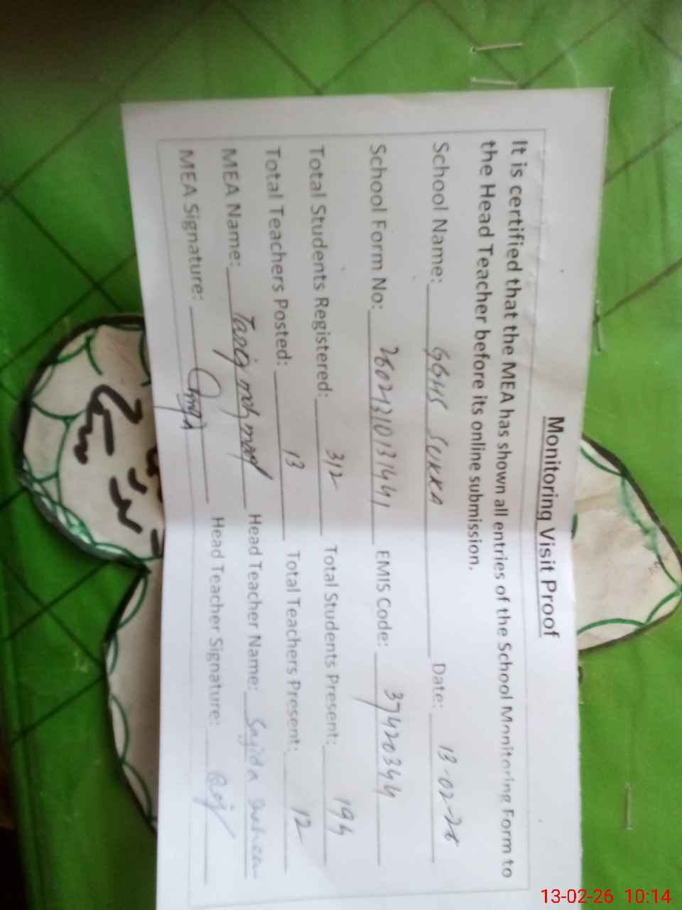 | Certified that this School was Inspected by the Undersigned MEA/DMO Today and the Information Stated Above is as Per Record. | |||||