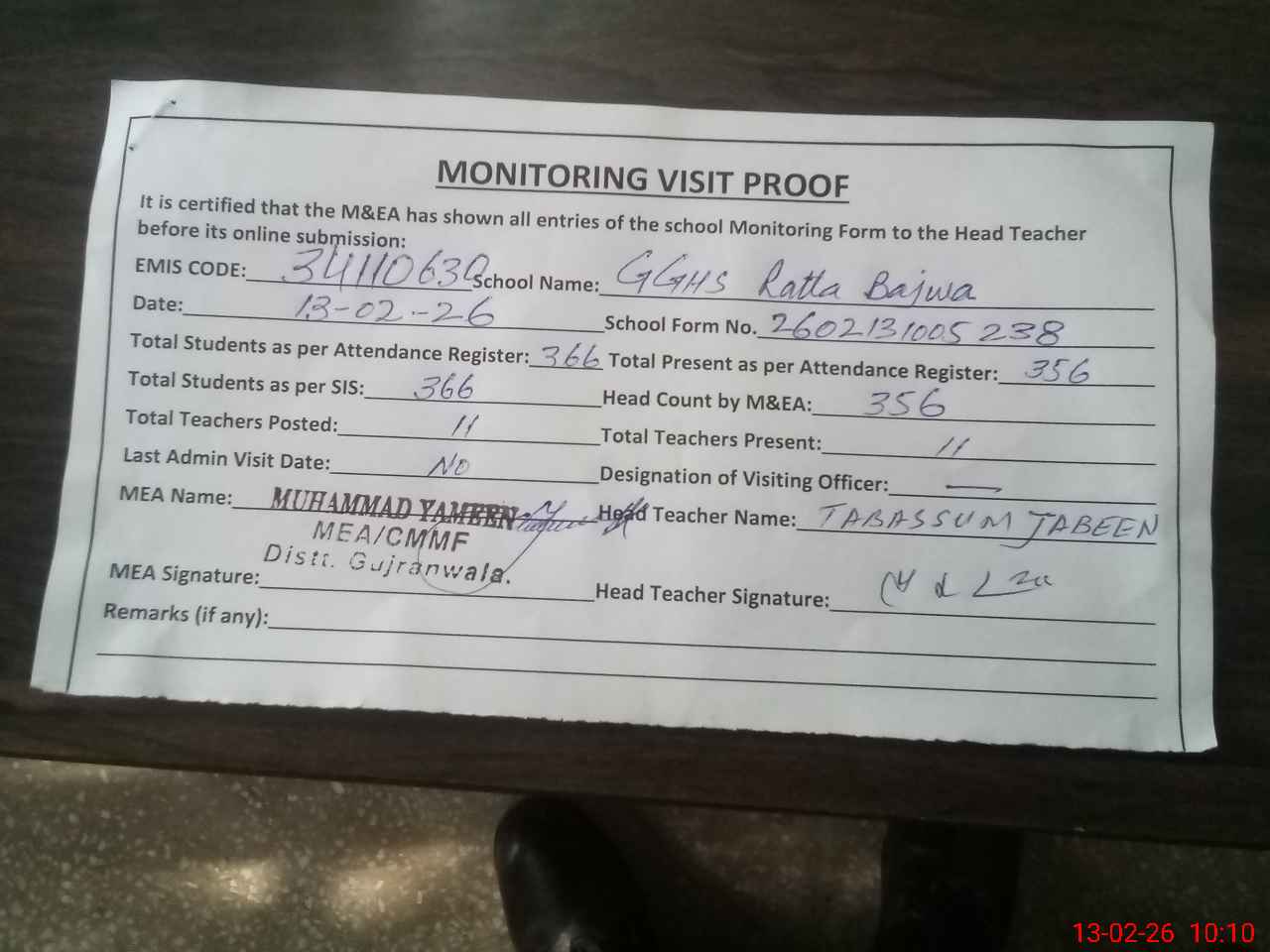 | Certified that this School was Inspected by the Undersigned MEA/DMO Today and the Information Stated Above is as Per Record. | |||||