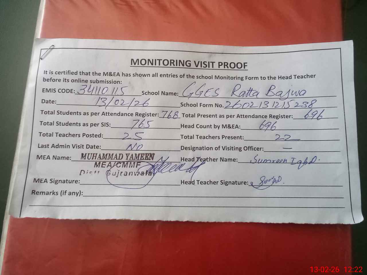 | EMIS Code: 34110115 | Name of School: GGES RATTA BAJWA | |||