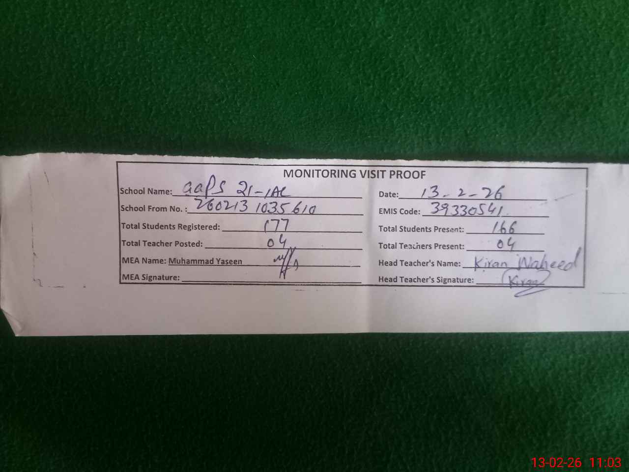 | Attendance Register | Head Teacher | MEA with School | Visit Proof |