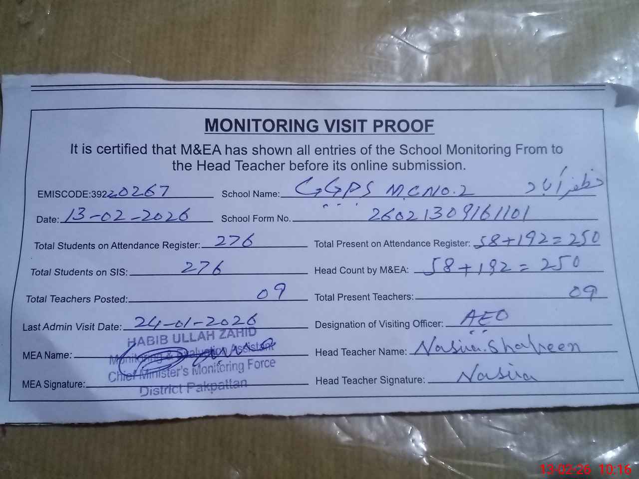 | EMIS Code: 39220267 | Name of School: GGPS MC NO. 2 MUZAFAR ABAD | |||