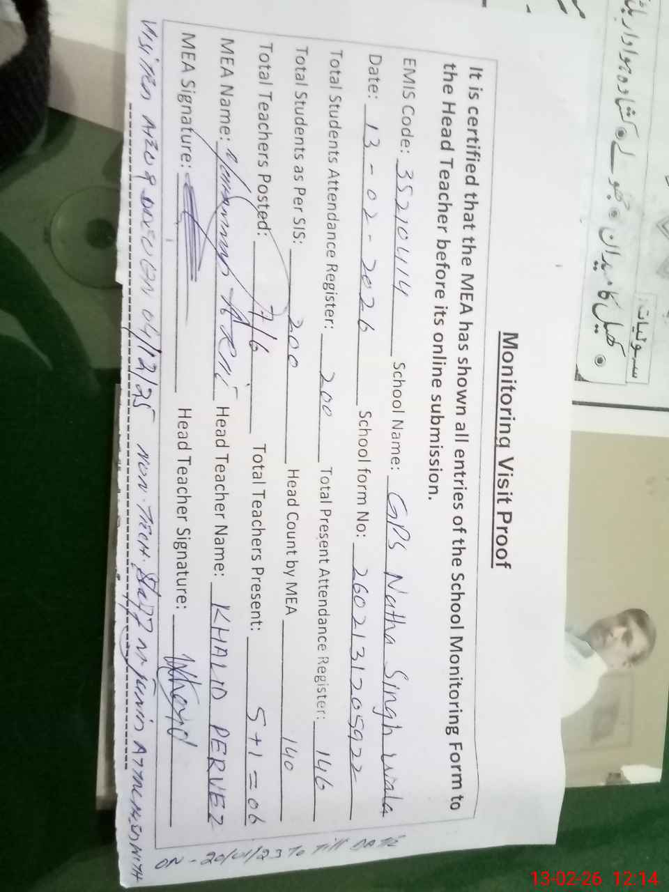 | Attendance Register | Head Teacher | MEA with School | Visit Proof |