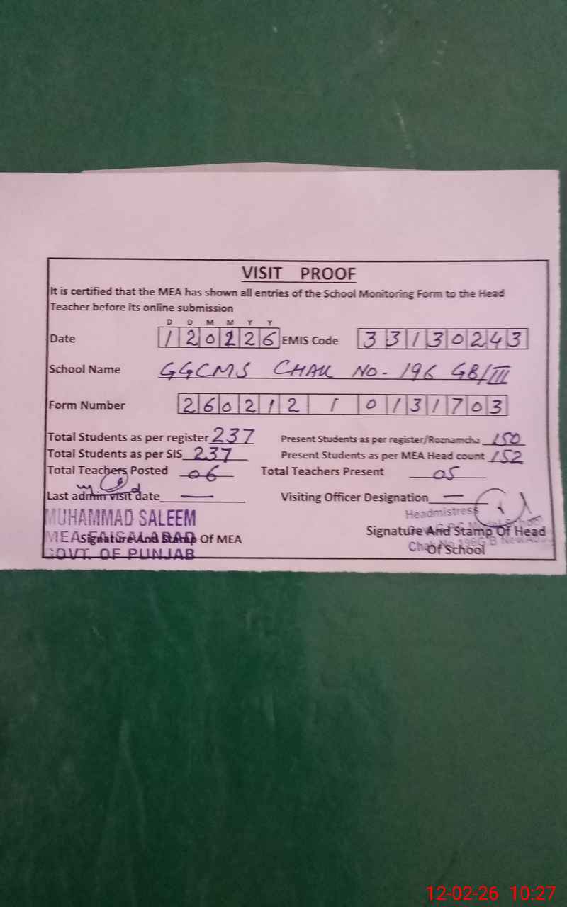 | EMIS Code: 33130243 | Name of School: GGCMS CHAK 196 GB III SANDOORI | |||