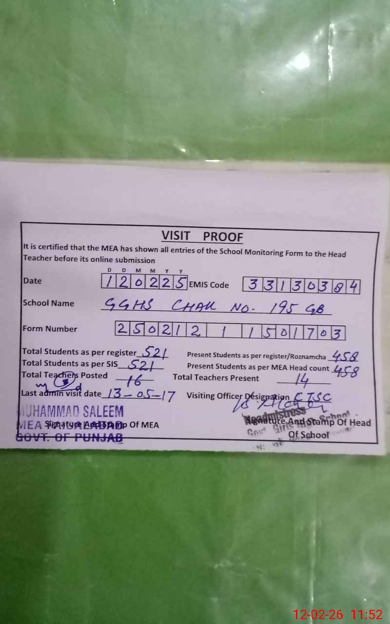 | EMIS Code: 33130384 | Name of School: GGHS CHAK NO 195 GB | |||