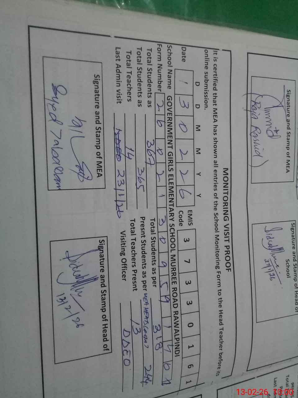 | Certified that this School was Inspected by the Undersigned MEA/DMO Today and the Information Stated Above is as Per Record. | |||||