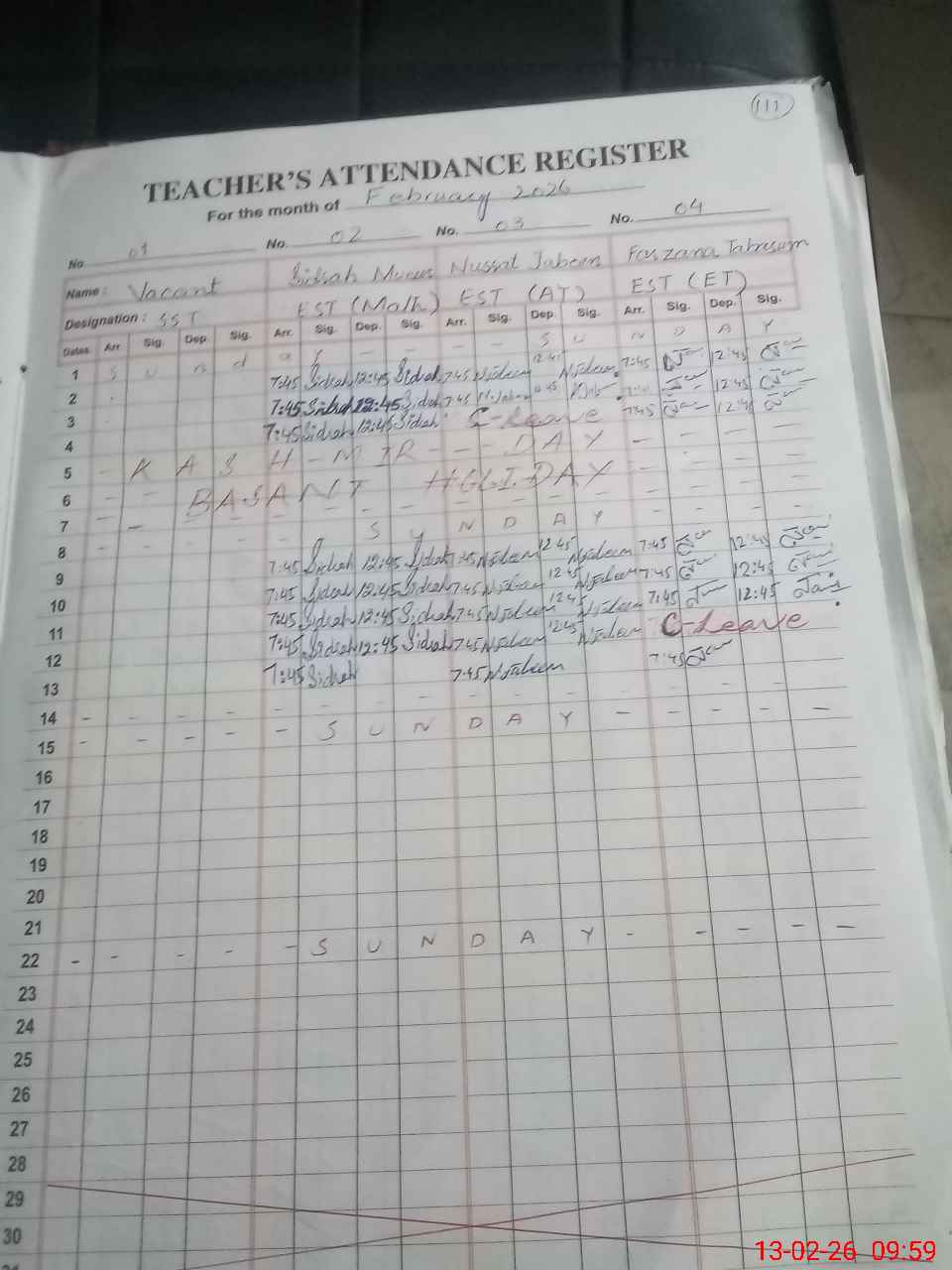 | 37**** | Ma**** Ka**** | PST Science/Maths | Regular | 0 | 0 | 0 | 0 | 0 | 0 | 0 | 0 | 0 | Maternity |
