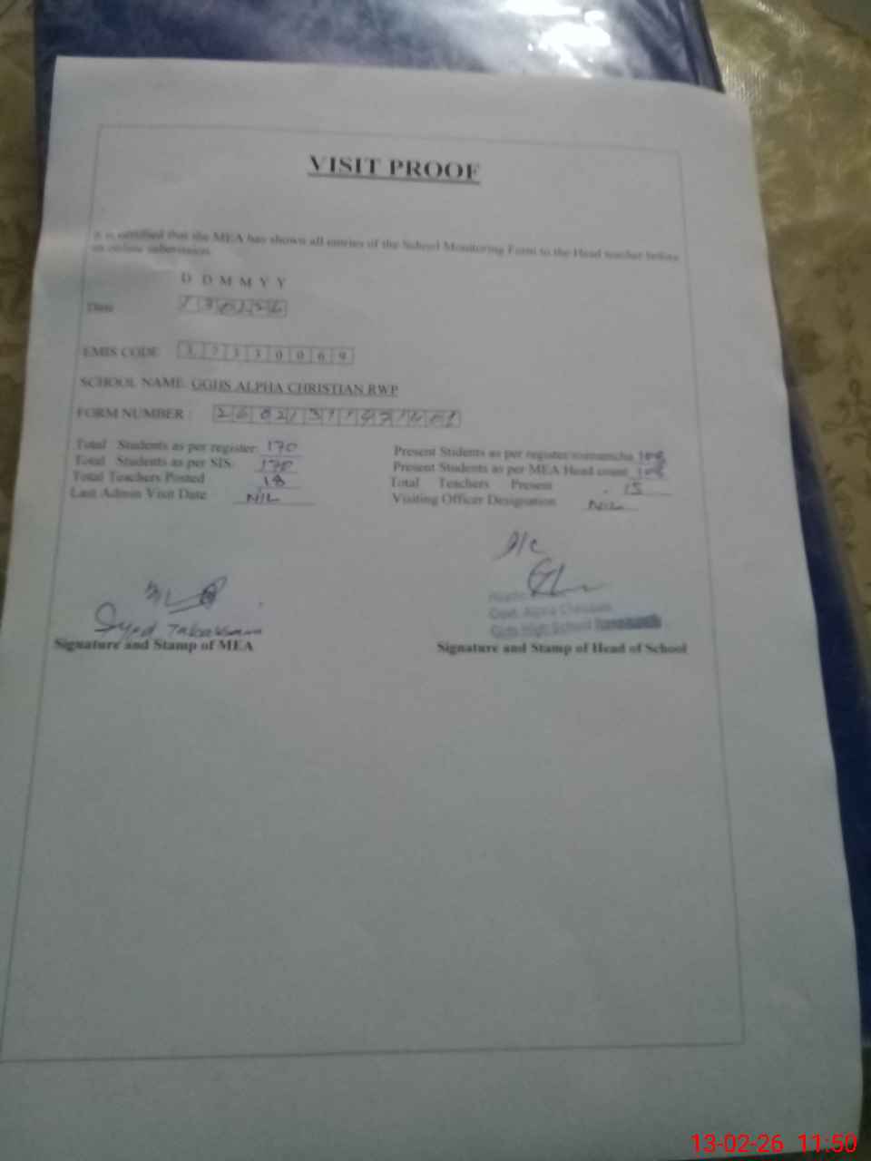 | Attendance Register | Head Teacher | MEA with School | Visit Proof |