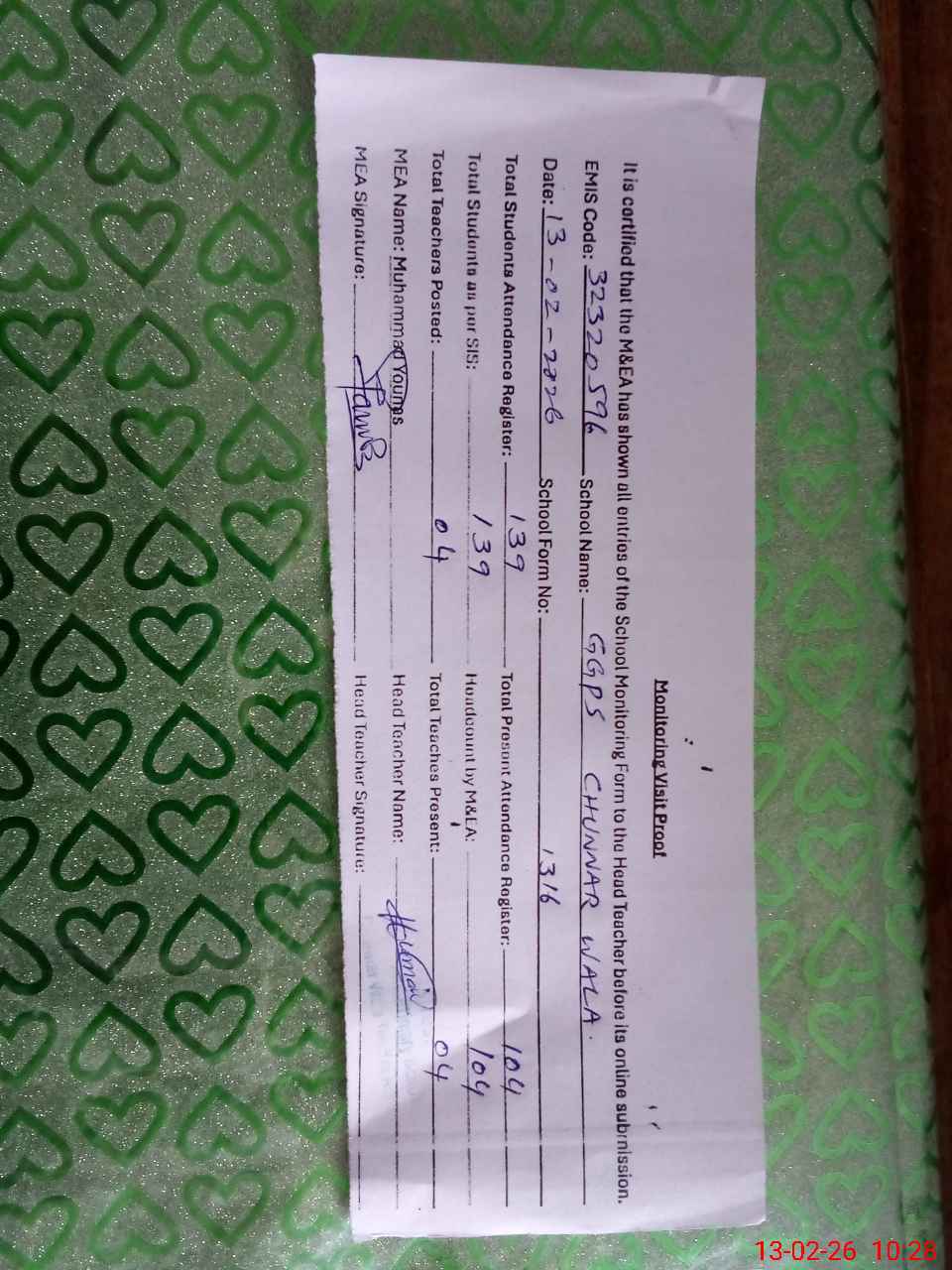 | Attendance Register | Head Teacher | MEA with School | Visit Proof |
