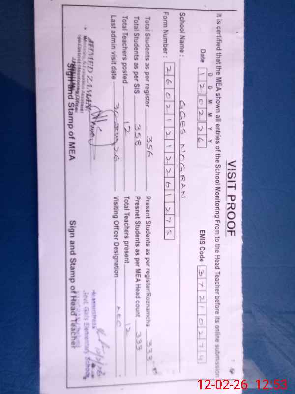 | Attendance Register | Head Teacher | MEA with School | Visit Proof |