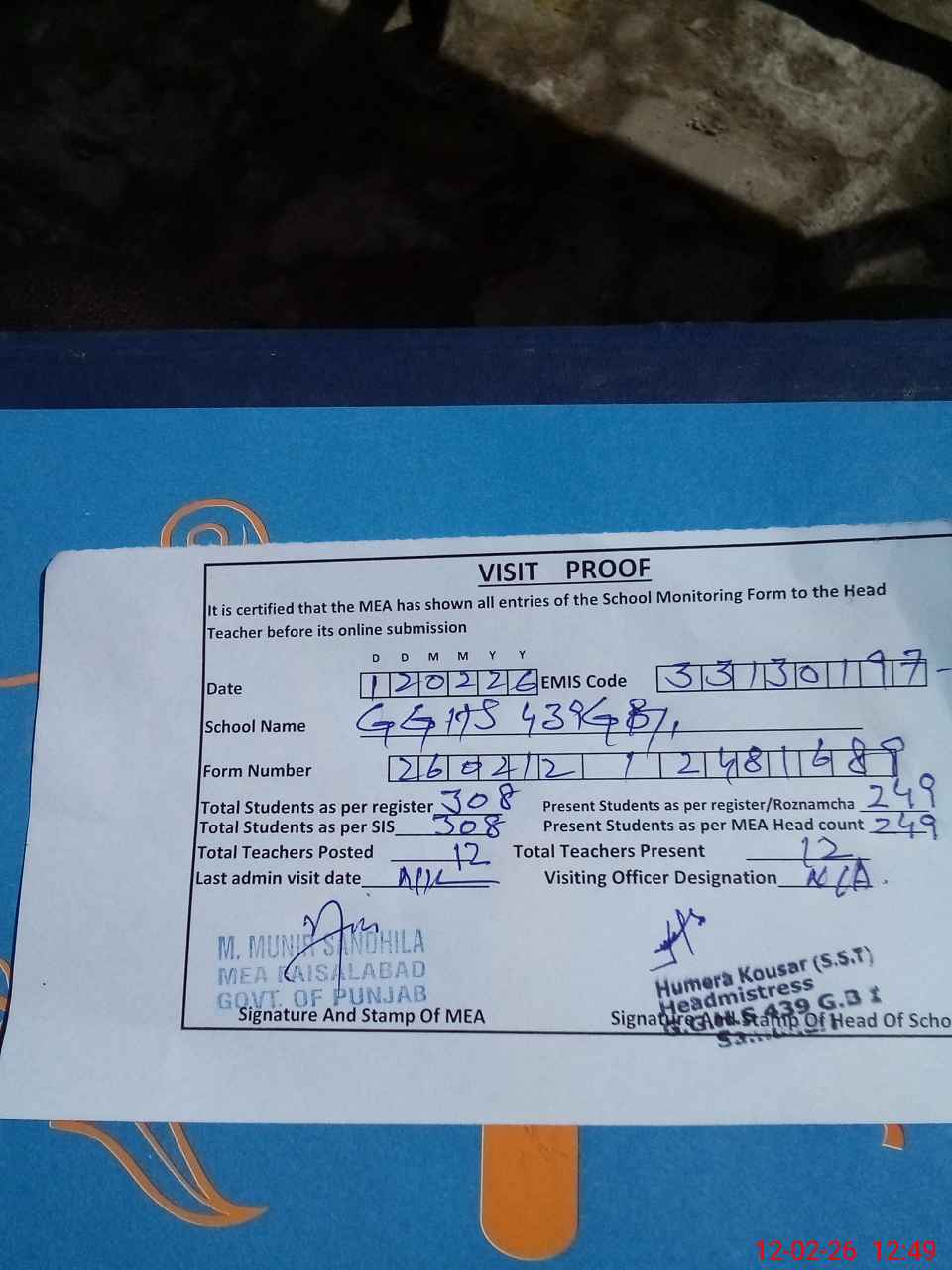 | EMIS Code: 33130197 | Name of School: GGHS CHAK 439 GB I SAMUNDRI | |||