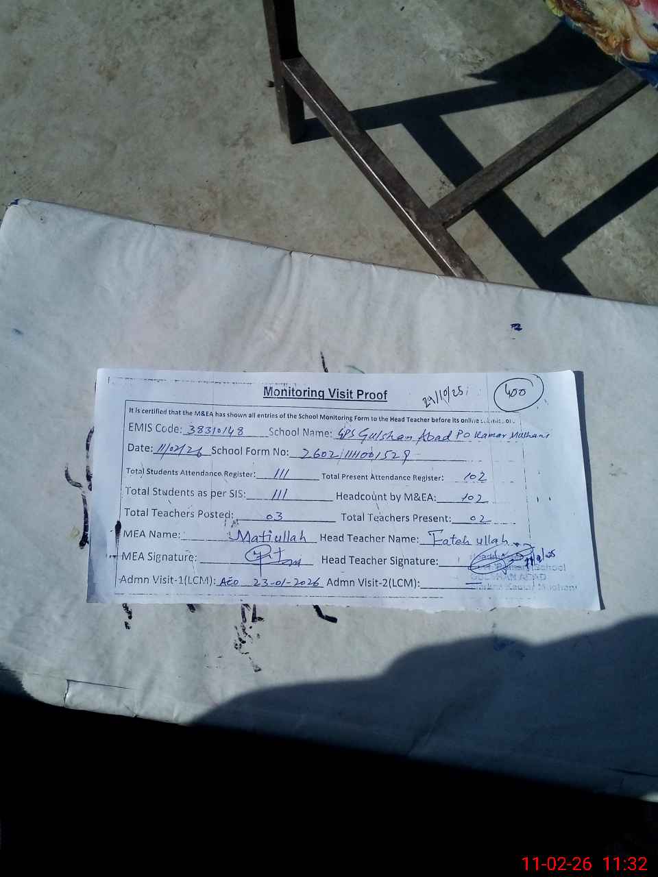| Attendance Register | Head Teacher | MEA with School | Visit Proof |