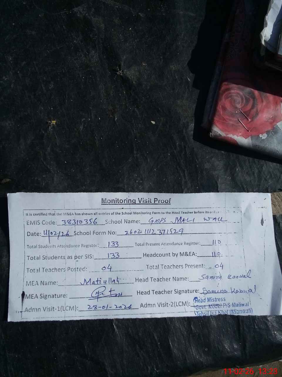 | Attendance Register | Head Teacher | MEA with School | Visit Proof |