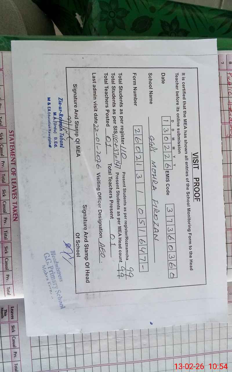 | EMIS Code: 37360360 | Name of School: GGPS MOHRA FIROZAN | |||