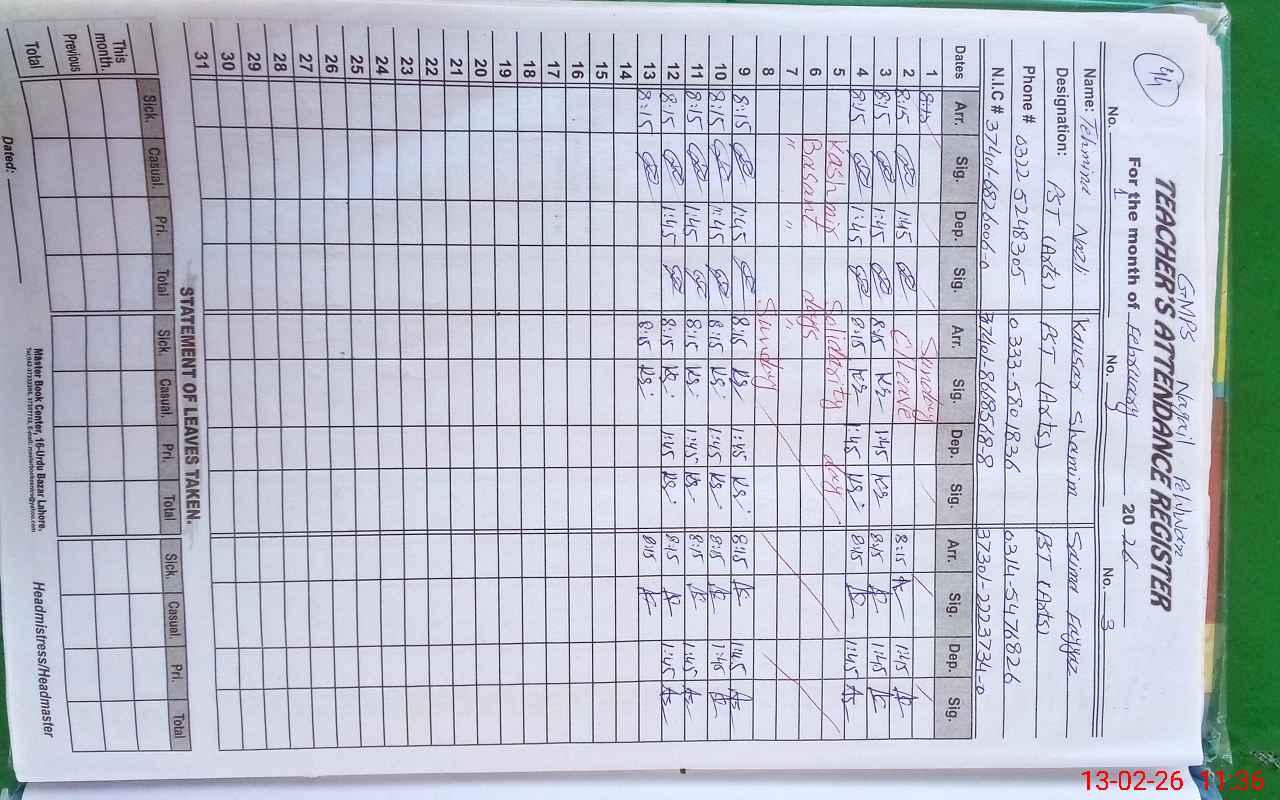 | CNIC | Full Name | Designation | R/C | Absence During Last Calender Month |