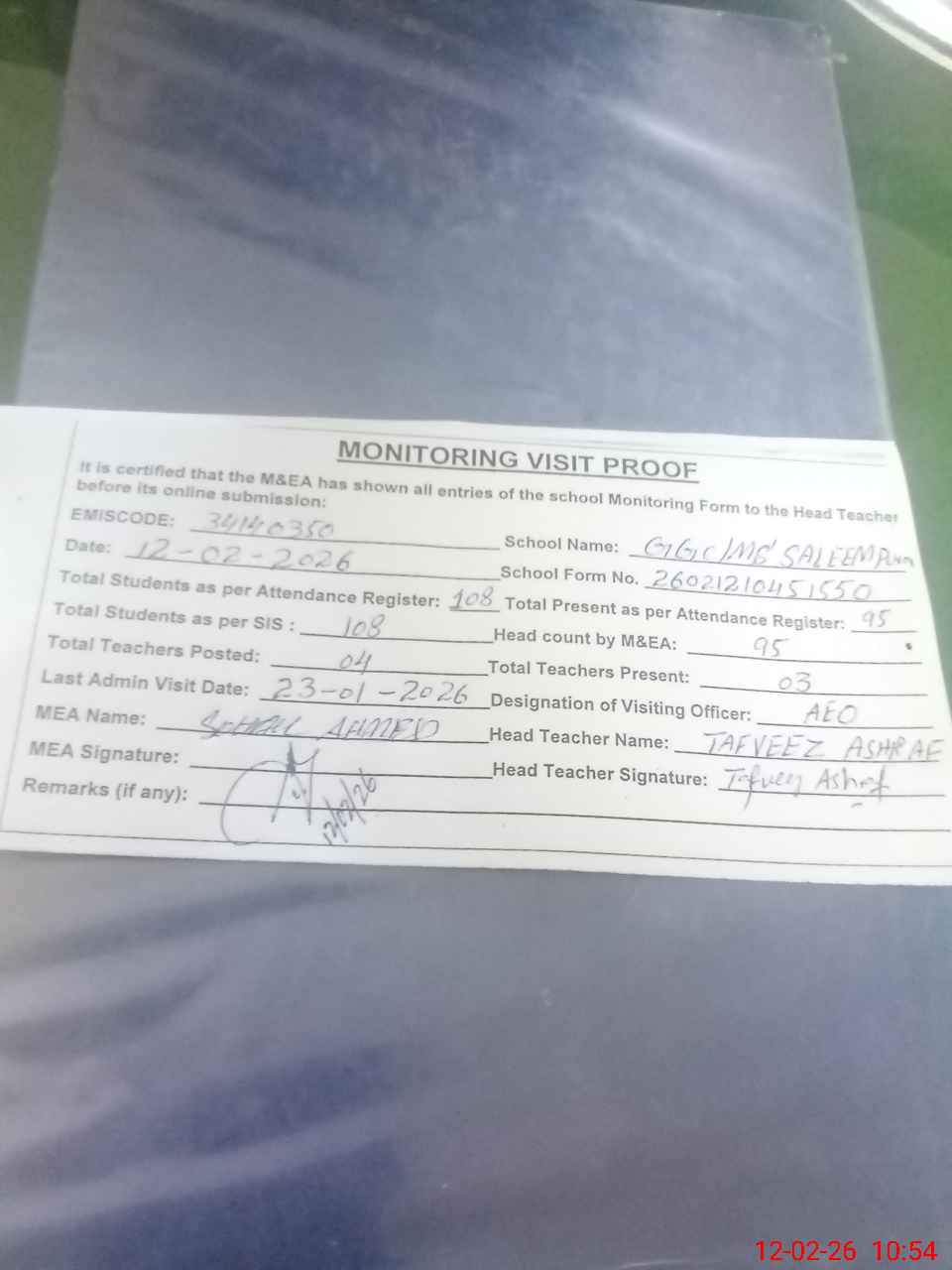| Attendance Register | Head Teacher | MEA with School | Visit Proof |
