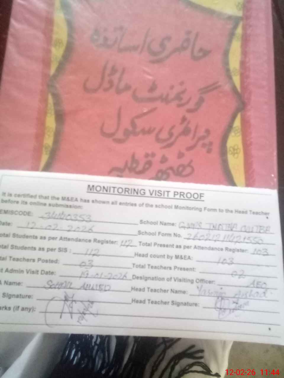 | Attendance Register | Head Teacher | MEA with School | Visit Proof |