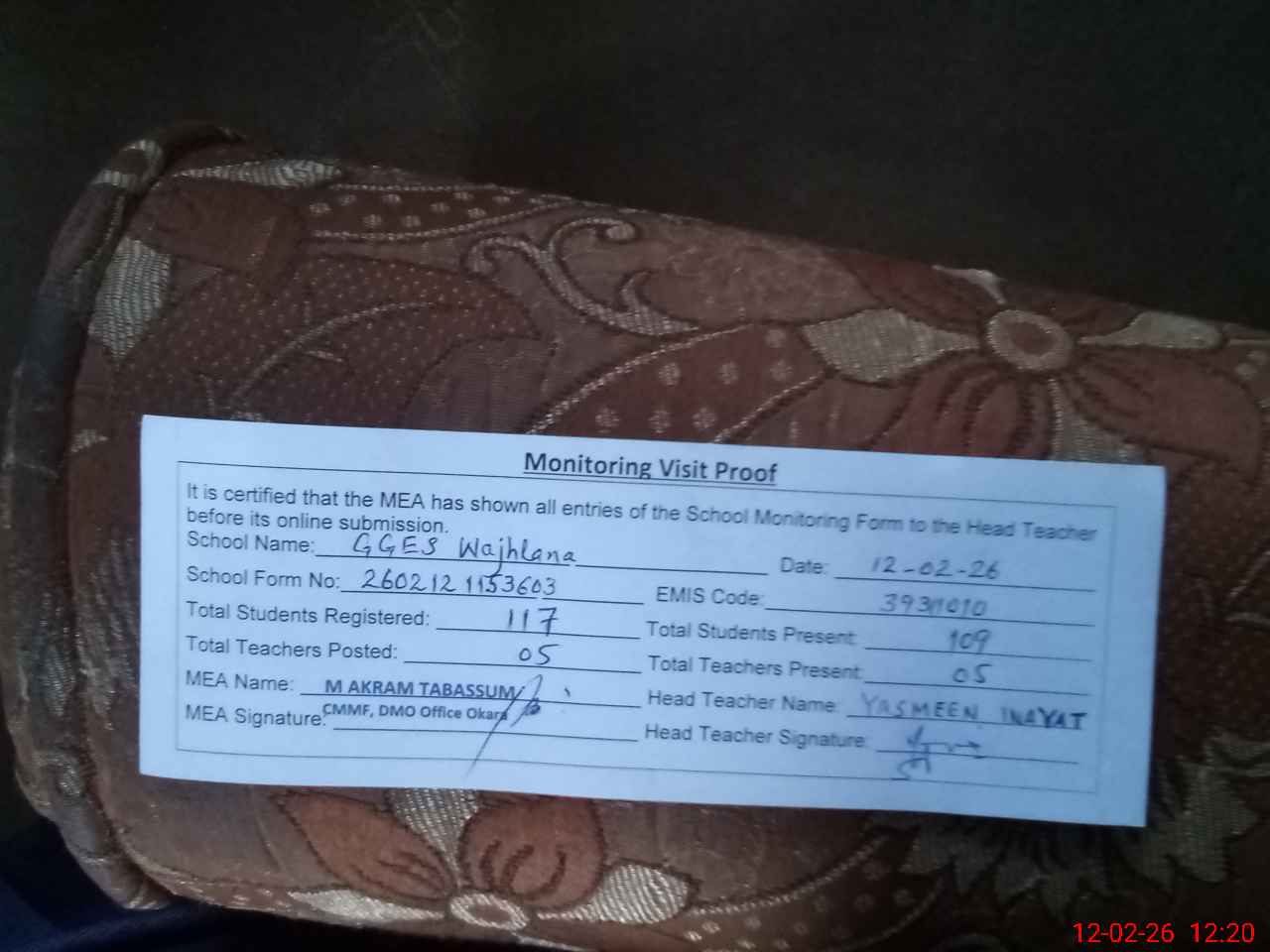| Attendance Register | Head Teacher | MEA with School | Visit Proof |