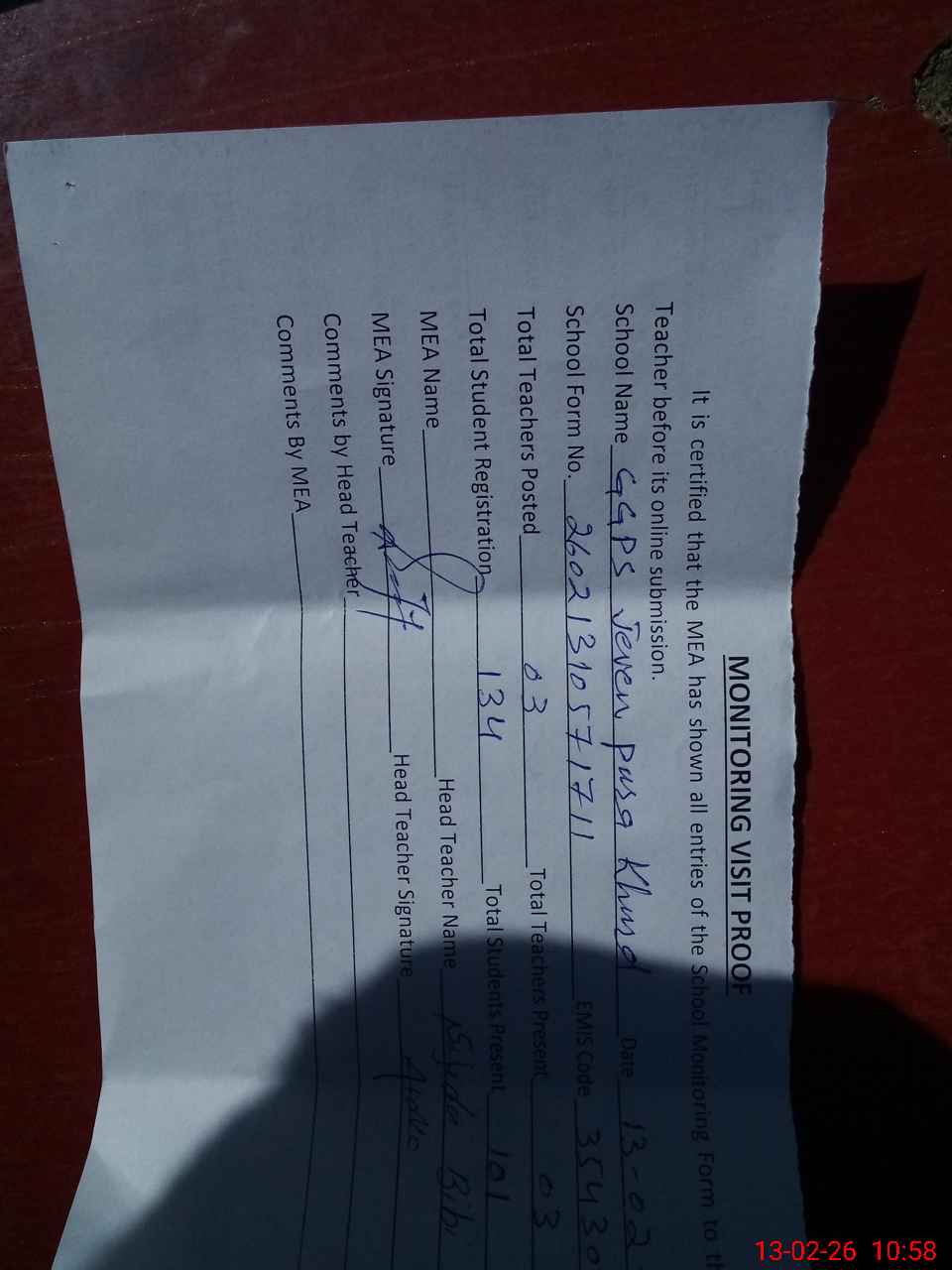 | Attendance Register | Head Teacher | MEA with School | Visit Proof |