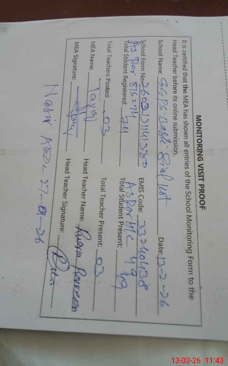 | EMIS Code: 33240438 | Name of School: GGPS BASTI SIALKOT | |||
