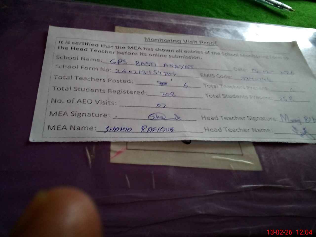 | Attendance Register | Head Teacher | MEA with School | Visit Proof |