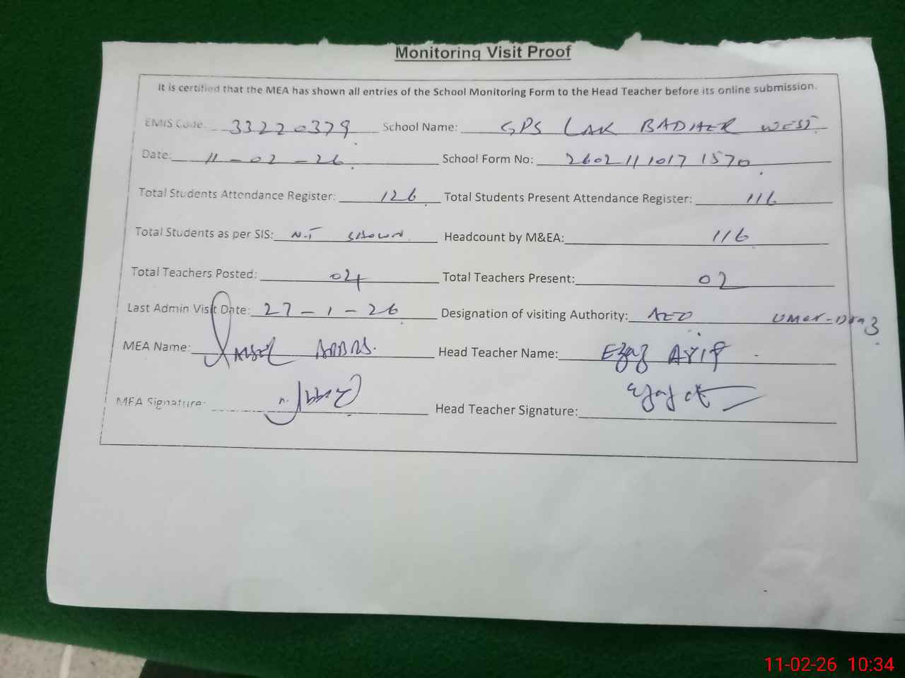 | Attendance Register | Head Teacher | MEA with School | Visit Proof |