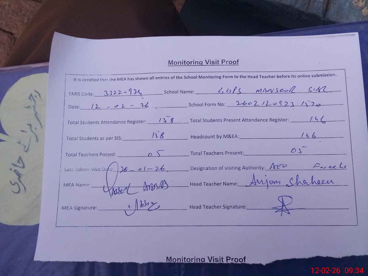 | Attendance Register | Head Teacher | MEA with School | Visit Proof |