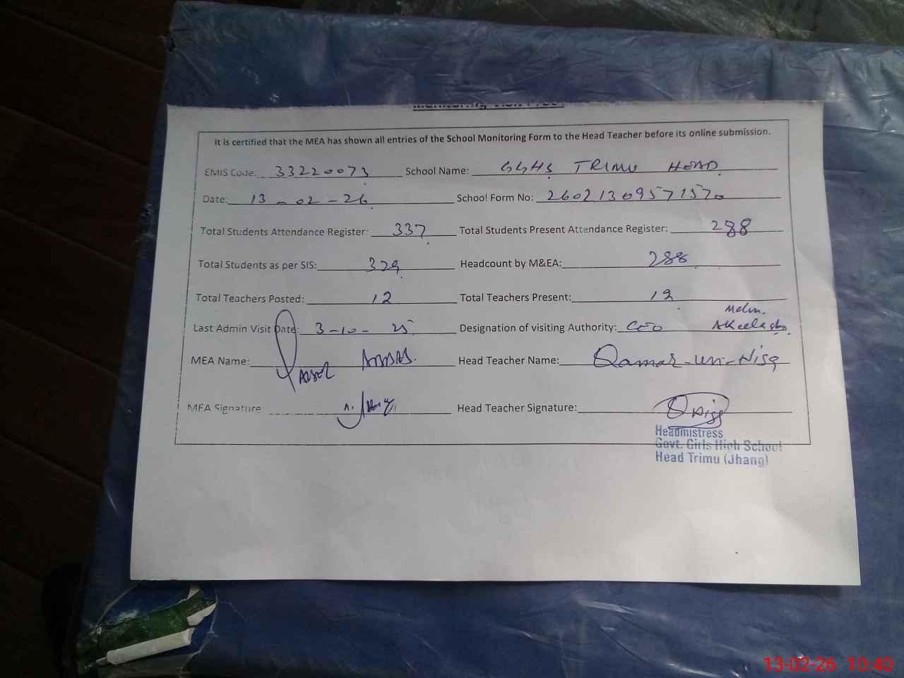 | Name: Qa**** UnNi**** Si**** Designation: (School Headmaster's/Headmistress's) In charge HEADMISTRESS Phone/Cell Number: 03**** |