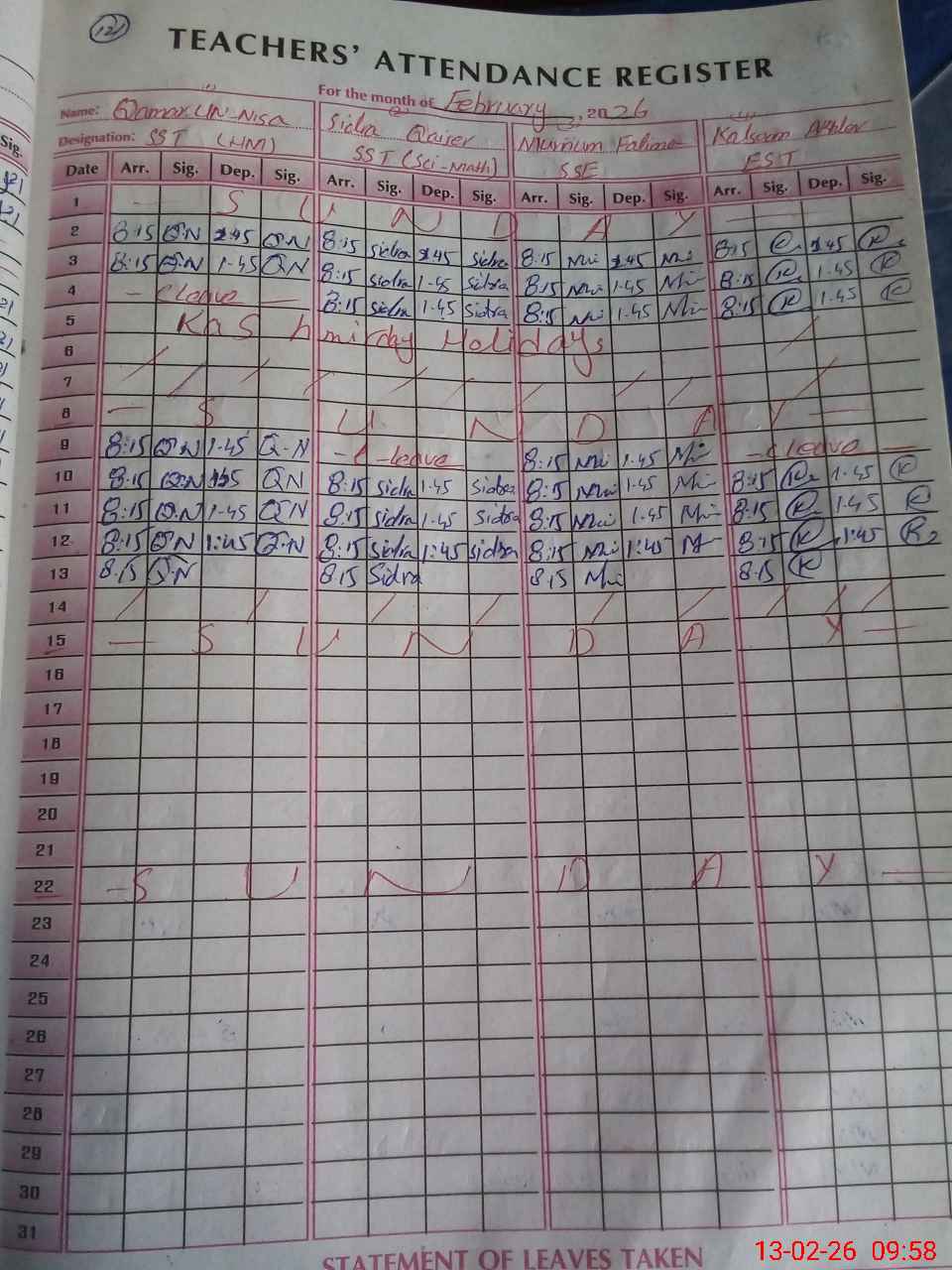 | Leave | Duty | Absent | Maternity | Medical | Ex- Pak |