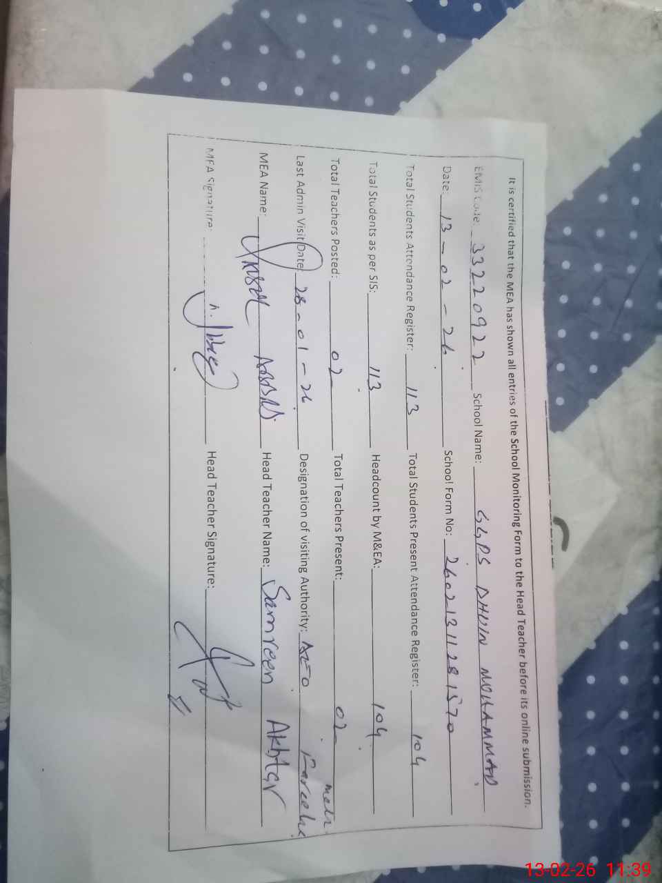 | Certified that this School was Inspected by the Undersigned MEA/DMO Today and the Information Stated Above is as Per Record. | |||||